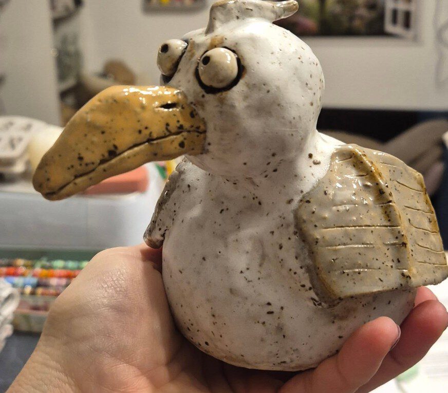 Langsam wird das was mit mir und dem Material „Ton“. Ich fühle mich mehr und mehr wohler mit diesem neuen Material und es tun sich für mich Universen auf – und die Ideen im Kopf stehen nicht mehr still. Wie findet ihr mein neues Federvieh? DIESE Möwe klaut keinem die Pommes.